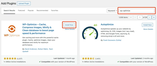 3. Search for ‘WP-Optimize’ using the search bar on the top right corner of your screen.